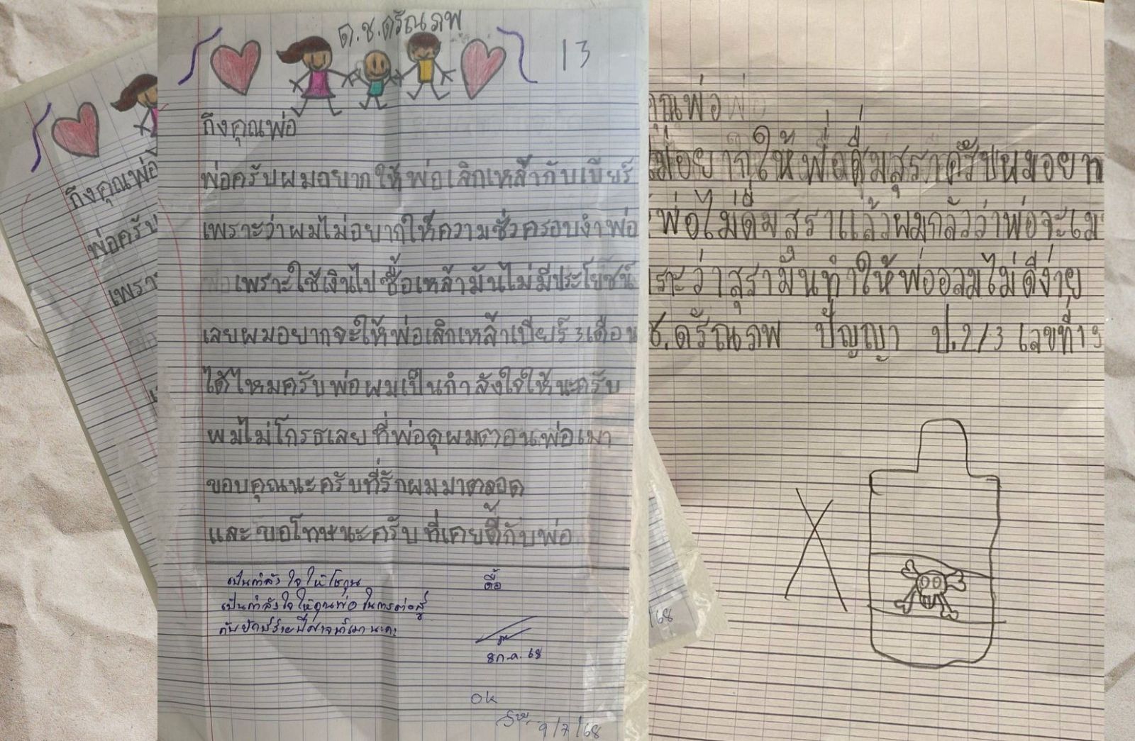 สำนักงานกองทุนสนับสนุนการสร้างเสริมสุขภาพ (สสส.) ร่วมกับเครือข่ายองค์กรงดเหล้า และเครือข่ายโรงเรียนคำพ่อสอน เปิดพื้นที่ให้เด็กๆ เขียน “จดหมายสื่อรัก” สำหรับกิจกรรม “โพธิสัตว์น้อย ลูกขอพ่อแม่เลิกเหล้า” ชวนพ่อแม่งดเหล้าในช่วงเข้าพรรษา ปี 2568 จนเกิดเรื่องราวแห่งการเปลี่ยนแปลงในหลายครอบครัว หลัง “ออกพรรษา” ให้เป็นการเริ่มต้นชีวิตใหม่ที่อบอุ่นและงดงามกว่าเดิม