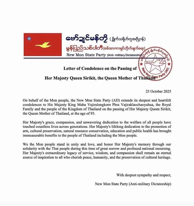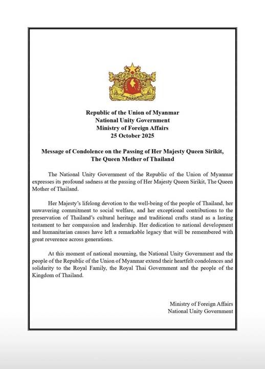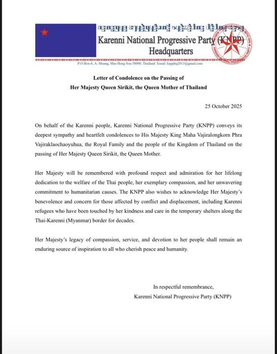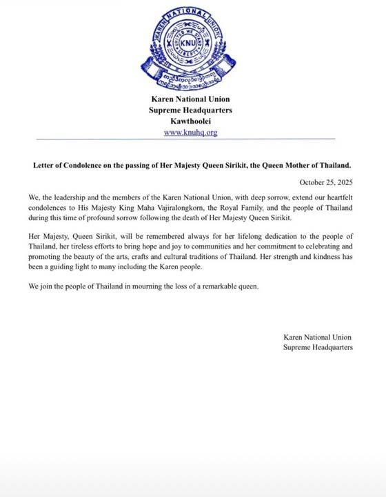 วันนี้ กองกำลังบนชายแดนไทย-เมียนมา กลุ่มสำคัญๆ ทั้งสภากอบกู้รัฐฉาน พรรครัฐมอญใหม่ พรรคก้าวหน้าแห่งชาติคะยาห์ สหภาพแห่งชาติกะเหรี่ยง รัฐบาลเอกภาพชาติ ต่างแสดงความอาลัยพร้อมแสดงความซาบซึ้งในพระมหากรุณาธิคุณของสมเด็จพระพันปีหลวงโดยพร้อมเพรียงกัน ถือเป็นนิมิตหมายที่ดีในความสัมพันธ์ระหว่างเรากับเพื่อนบ้านฟากตะวันตกครับ