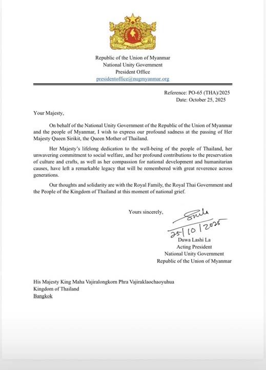 กองกำลังชาติพันธุ์ตามชายแดนไทย-เมียนมา และรัฐบาลเอกภาพชาติของเมียนมา รวมถึงกองกำลังอื่นๆอีกบางส่วน ร่วมออกแถลงการณ์แสดงความอาลัยต่อการสวรรคตของสมเด็จพระพันปีหลวง