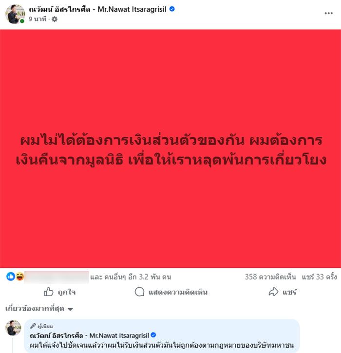 ล่าสุด "ณวัฒน์ อิสรไกรศีล" ได้โพสต์ข้อความลงบนเฟซบุ๊ก ระบุว่า "ผมไม่ได้ต้องการเงินส่วนตัวของกัน ผมต้องการเงินคืนจากมูลนิธิ เพื่อให้เราหลุดพ้นการเกี่ยวโยง" พร้อมทั้งโพสต์ข้อความในคอมเมนต์อีกว่า "ผมได้แจ้งไปชัดเจนแล้วว่าผมไม่รับเงินส่วนตัวมันไม่ถูกต้องตามกฎหมายของบริษัทมหาชน"