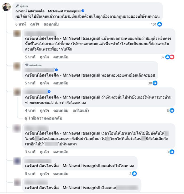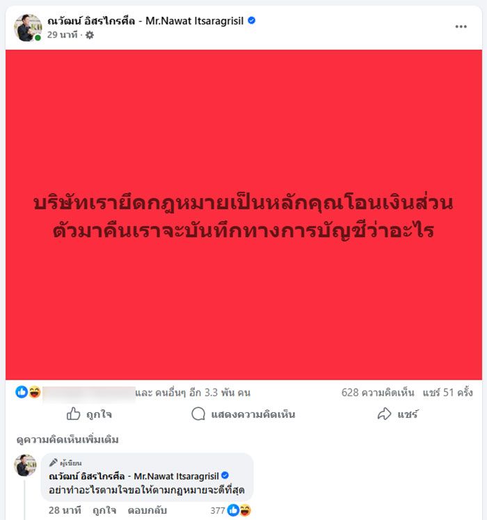 และล่าสุด "ณวัฒน์ อิสรไกรศีล" ได้โพสต์อีกว่า "บริษัทเรายึดกฎหมายเป็นหลักคุณโอนเงินส่วนตัวมาคืนเราจะบันทึกทางการบัญชีว่าอะไร" พร้อมคอมเมนต์ว่า "อย่าทำอะไรตามใจขอให้ตามกฏหมายจะดีที่สุด"