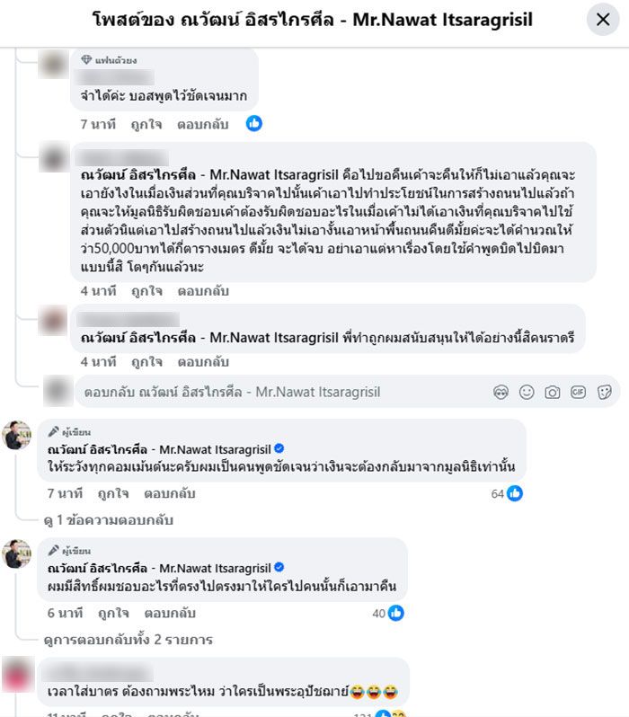 จากนั้น "ณวัฒน์ อิสรไกรศีล" โพสต์ข้อความในคอมเมนต์ต่อว่า "ให้ระวังทุกคอมเม้นต์นะครับผมเป็นคนพูดชัดเจนว่าเงินจะต้องกลับมาจากมูลนิธิเท่านั้น , ผมมีสิทธิ์ผมชอบอะไรที่ตรงไปตรงมาให้ใครไปคนนั้นก็เอามาคืน"