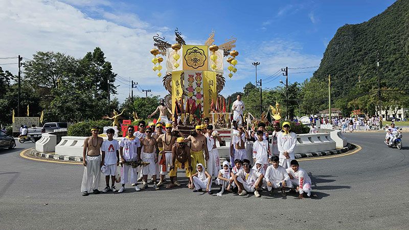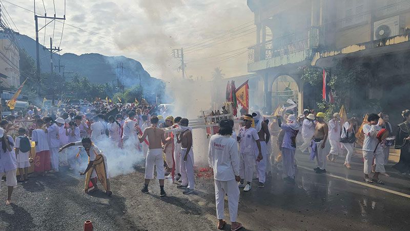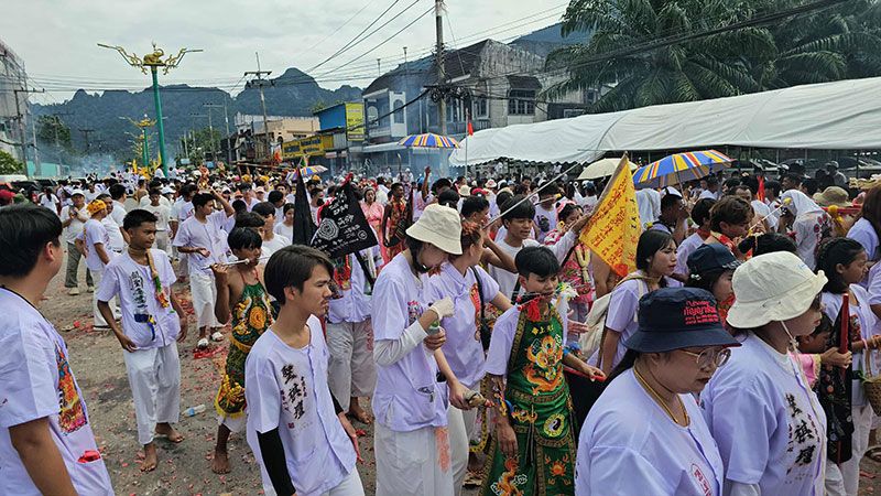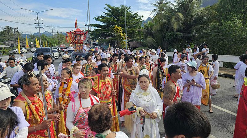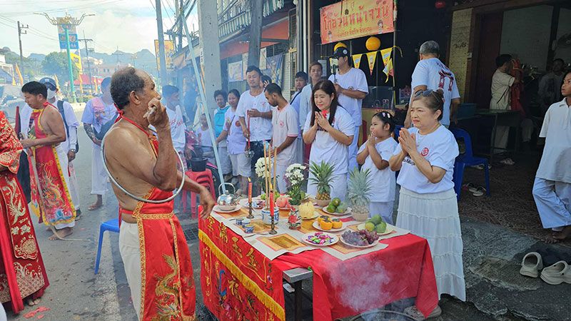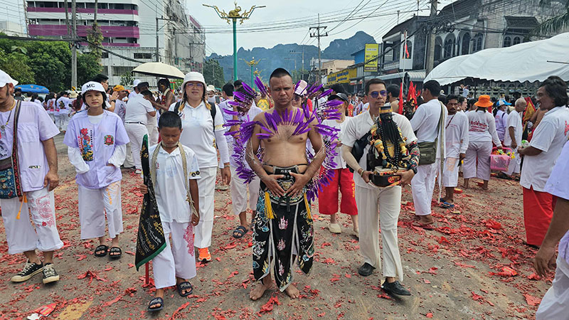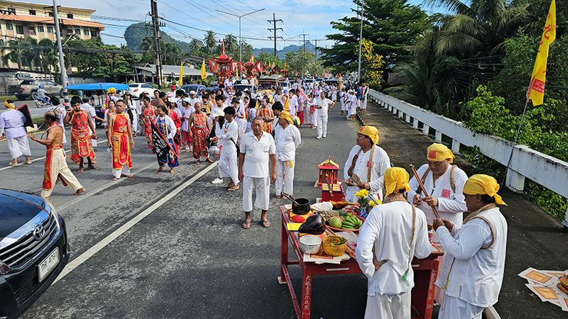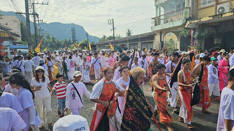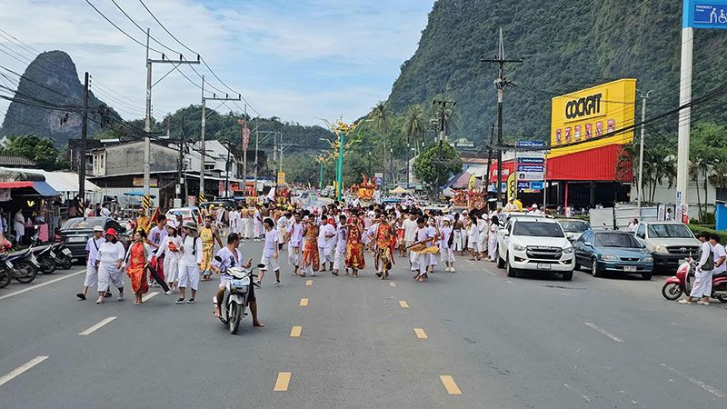 โดยมีประชาชนเชื้อสายจีนที่มีภูมิลำเนาอยู่ในเขตอำเภอเมืองพังงาและพื้นที่ข้างเคียง รวมทั้งนักท่องเที่ยวได้ร่วมกันแต่งกายด้วยชุดขาวเข้าร่วมพิธีคอยติดตามขบวนแห่กว่า 5,000 คน และมีการตั้งโต๊ะที่บริเวณหน้าบ้าน พร้อมด้วย ธูป เทียน น้ำชา และบรรดาผลไม้นานาชนิดเพื่อรอรับขบวนพระผ่านหน้าบ้านเพื่อความเป็นสิริมงคลนำความโชคดีเข้ามาสู่บ้านเรือน โดยขบวนแห่พระได้แห่ไปรอบๆเขตเทศบาลเมืองพังงา ไปสิ้นสุดพิธีที่ศาลเจ้าแม่ม่าจ้อโป๋