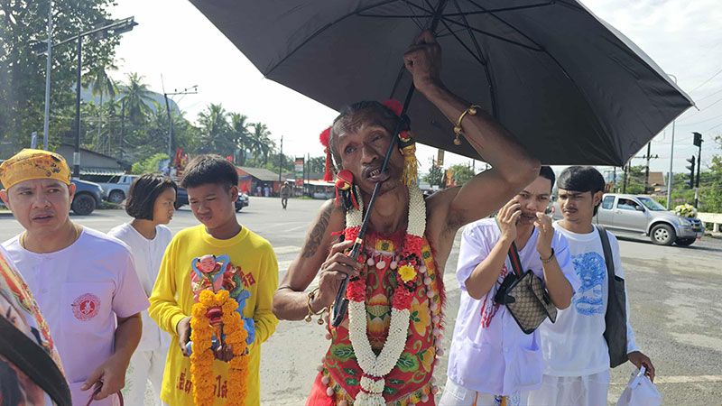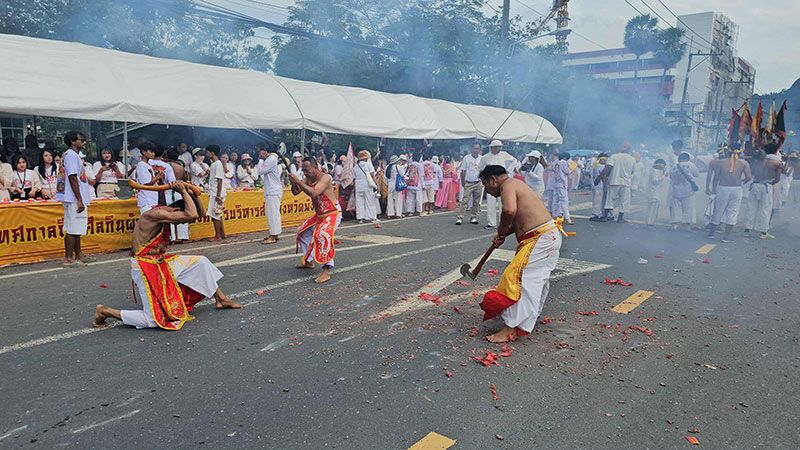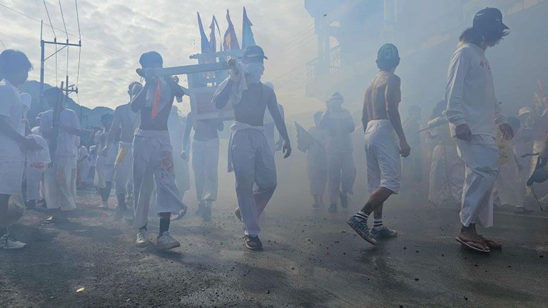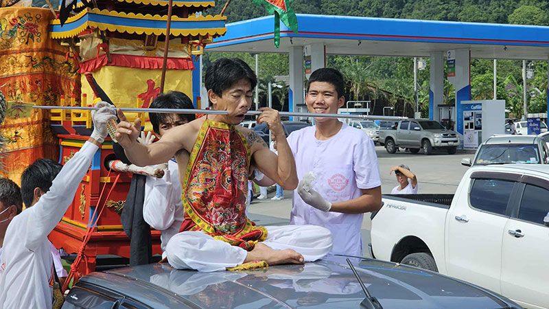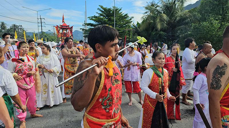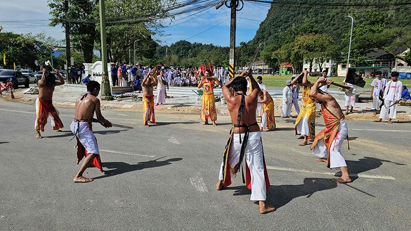 27 ตุลาคม 2568 เมื่อเวลา 09.00 น. ซึ่งเป็นวันที่ 7 ของประเพณีถือศีลกินผัก ปี 2568 บรรดาศาลเจ้าในจังหวัดพังงา นำโดยศาลเจ้าแม่ม่าจ้อโป๋ พร้อมด้วยศาลเจ้าอื่นๆ อีกหลายแห่งในเขต อ.เมืองพังงา และอำเภอใกล้เคียงมากกว่า20 ศาลเจ้า ได้ร่วมกันประกอบพิธีเฉี้ยโห้ย(อัญเชิญไฟศักดิ์สิทธิ์) พร้อมกับพิธีอิ้วเก้ง หรือแห่พระรอบเมือง ซึ่งเปรียบเหมือนเป็นการเสด็จออกประพาสเพื่อโปรดสัตว์หรือทำนองออกเยี่ยมราษฎรของพระมหากษัตริย์ในโบราณ ซึ่งมีบรรดาเหล่าม้าทรงของเทพเจ้าจีน ทั้งผู้ชาย ผู้หญิงกว่า 500 องค์ ร่วมแสดงอิทธิฤทธิ์ด้วยการทรมานร่างกาย โดยการใช้อุปกรณ์นานาชนิด และหลากหลายรูปแบบ ซึ่งส่วนใหญ่เป็นของมีคมทิ่มแทงไปตามอวัยวะต่างๆ ของร่างกาย ซึ่งเชื่อว่าเป็นการรับเคราะห์แทนผู้ถือศีลกินผักตามความเชื่อมาแต่โบราณ