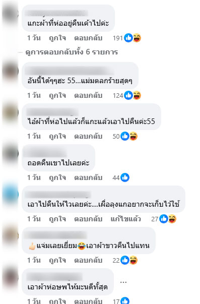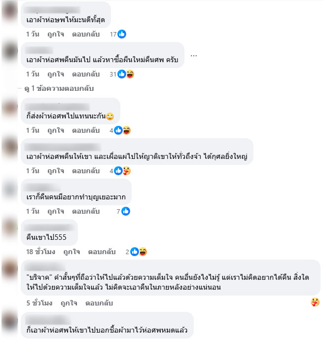 ทันทีที่โพสต์ดังกล่าวเผยแพร่ออกไป ก็มีชาวเน็ตเข้ามาร่วมแสดงความคิดเห็นอย่างล้นหลามและหลากหลาย อาทิ "แกะผ้าที่ห่ออยู่คืนเค้าไปค่ะ" , "เอาผ้าห่อศพคืนมันไป แล้วหาซื้อผืนใหม่คืนศพ ครับ" , "เอาไปคืนให้ไวเลยค่ะ....เผื่อลุงแกอยากจะเก็บไว้ใช้" หรือบางคนก็บอกว่า "บริจาค" คำสั้นๆที่ถือว่าให้ไปแล้วด้วยความเต็มใจ คนอื่นยังไงไม่รู้ แต่เราไม่คิดอยากได้คืน สิ่งใดให้ไปด้วยความเต็มใจแล้ว ไม่คิดจะเอาคืนในภายหลังอย่างแน่นอน