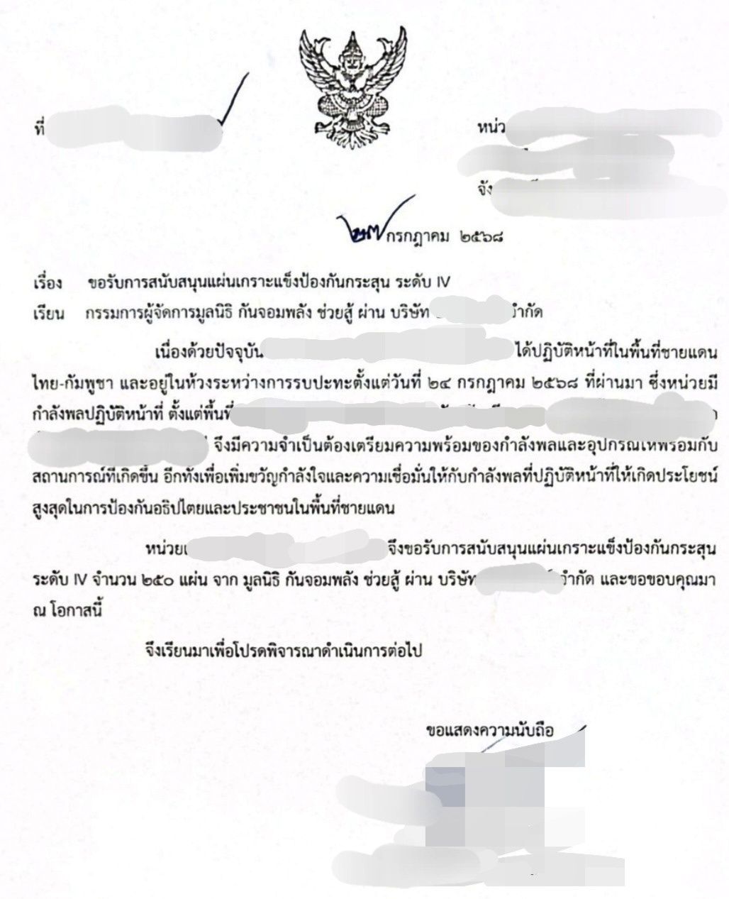 'กัน จอมพลัง'โชว์หนังสือหน่วยงานขอสนับสนุนแผ่นเกราะแข็งป้องกันกระสุน จากมูลนิธิ กันจอมพลัง ช่วยสู้ ลั่นอะไรที่ทำให้ทหาร-ตร.ปลอดภัยในตอนนั้น พร้อมทำหมด