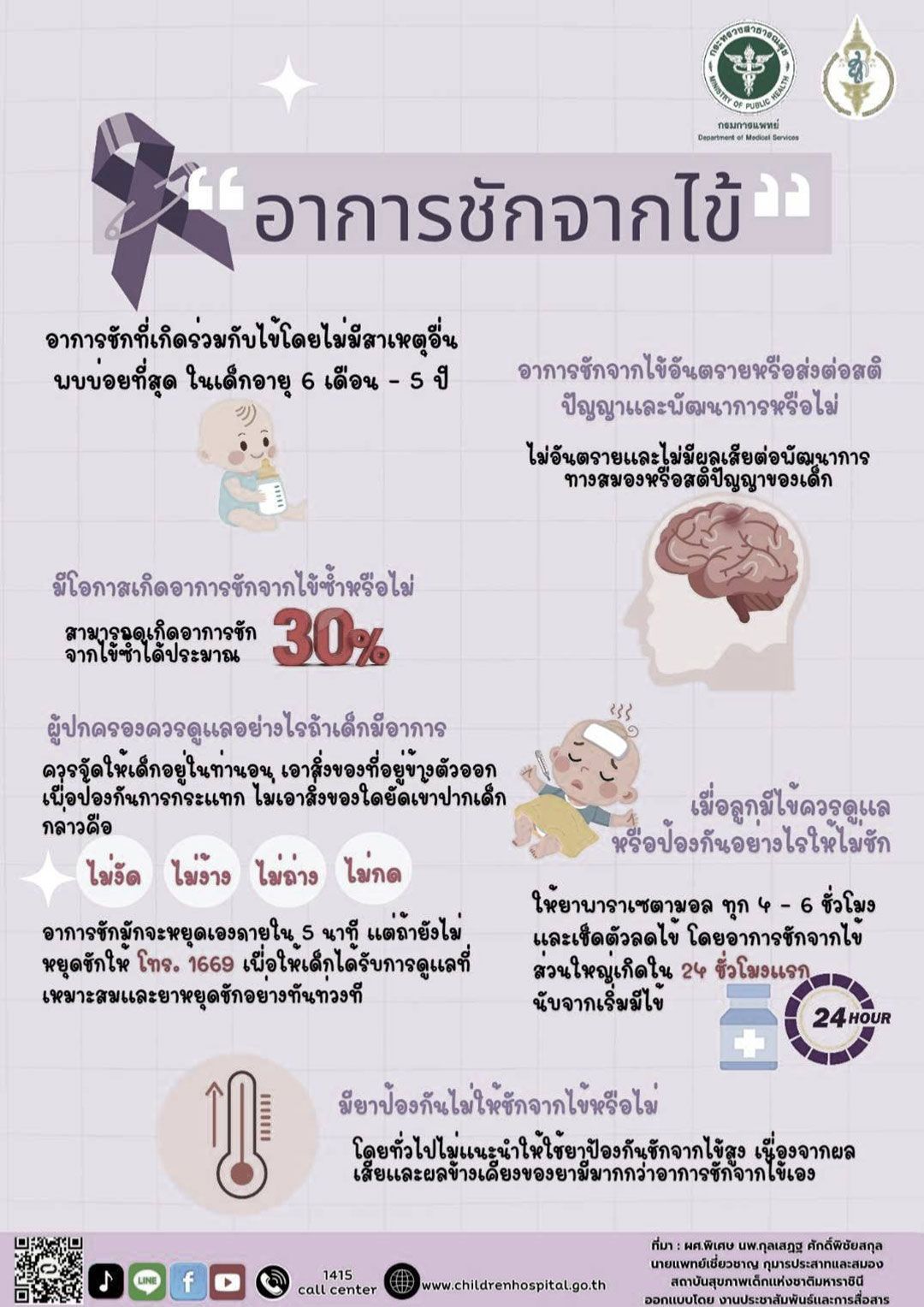 นายแพทย์ธนินทร์ เวชชาภินันท์ รองอธิบดีกรมการแพทย์ เปิดเผยว่า สาเหตุที่พบบ่อยที่สุดของอาการชักร่วมกับไข้ในเด็กคือ ภาวะชักจากไข้ ซึ่งโดยทั่วไปไม่ส่งผลต่อพัฒนาการและการเรียนรู้ อย่างไรก็ตาม แพทย์จำเป็นต้องประเมินอย่างรอบคอบเพื่อให้มั่นใจว่าอาการชักและไข้นั้นไม่ได้เกิดจากการติดเชื้อในสมอง ซึ่งหากได้รับการรักษาล่าช้าอาจส่งผลเสียต่อเด็กได้ นอกจากนี้ ในบางกรณีอาการชักอาจเกิดจากโรคลมชักบางชนิดในเด็ก แต่เป็นกรณีที่พบน้อยมาก โดยทั่วไปเด็กที่มีอาการชักจากไข้ จะกลายเป็นโรคลมชักในอนาคต แต่พบได้น้อย ข้อแตกต่างของโรคลมชัก คือ อาการชักจะเกิดขึ้นได้โดยไม่เกี่ยวข้องกับไข้และมักจะเกิดซ้ำอย่างน้อยหรือมากกว่า 2 ครั้ง ซึ่งถ้าเป็นโรคลมชัก การรักษาจำเป็นต้องกินยากันชักต่อเนื่อง แต่ถ้าเป็นอาการชักจากไข้สูง อาการชักทุกครั้งจะเกี่ยวข้องกับไข้ ซึ่งไม่ต้องกินยากันชักต่อเนื่อง