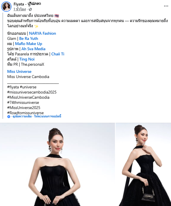 2 พ.ย. 68 เนียรี โสเจียตา มิสยูนิเวิร์สกัมพูชา เดินทางถึงสนามบินสุวรรณภูมิโดยสวัสดิภาพ ขอบคุณการต้อนรับอันอบอุ่น ระบุว่า "ฉันเดินทางถึงประเทศไทยอย่างปลอดภัยแล้วค่ะ ขอบคุณสำหรับการต้อนรับที่อบอุ่น ความใจดี และการสนับสนุนจากทุกคน ความรักของพวกคุณมีความหมายมากสำหรับฉันจริง ๆ"