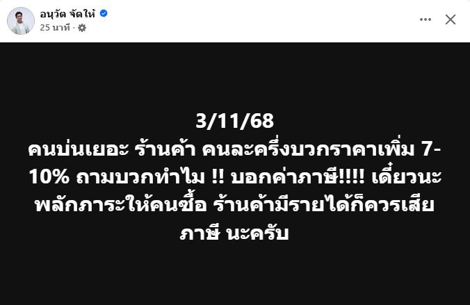เพจเฟซบุ๊ก อนุวัต จัดให้ นักข่าวชื่อดัง ได้อัพเดตเหตการณ์ ภายหลังรัฐบาลได้เริ่มให้ใช้โครงการคนละครึ่งพลัส โดยระบุข้อความว่า "3/11/68 คนบ่นเยอะ ร้านค้า คนละครึ่งบวกราคาเพิ่ม 7-10% ถามบวกทำไม !! บอกค่าภาษี!!!! เดี๋ยวนะ พลักภาระให้คนซื้อ ร้านค้ามีรายได้ก็ควรเสียภาษี นะครับ"