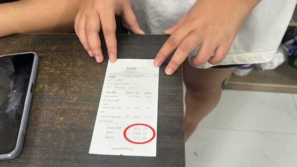 แต่เมื่อเธอตัดสินใจใช้สิทธิ์คนละครึ่งในวงเงินที่เหลืออยู่ 400 บาท และเลือกซื้อสินค้ารวม 3 รายการ มีราคา 149 บาท, 179 บาท และ 38 บาท ซึ่งรวมเป็นเงินทั้งสิ้น 366 บาท แต่ปรากฏว่า ยอดบิลที่ออกมากลับเป็น 391.62 บาท ซึ่งเมื่อคำนวณแล้วคือการ คิดราคาสินค้าเพิ่มไปอีก 7%