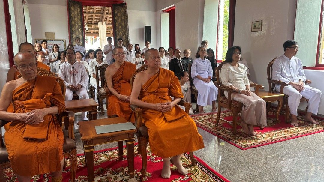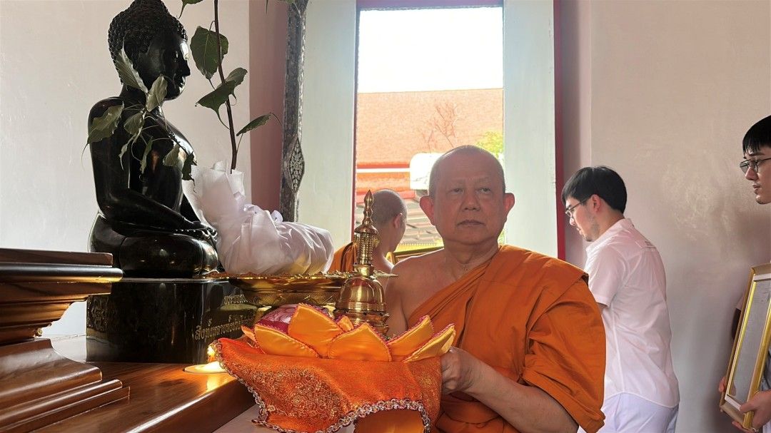 โดยประธานทั้ง 2 ฝ่าย พร้อมด้วยคณะสงฆ์และพุทธศาสนิกชน ได้ร่วมกันจับสายสิญจน์ขณะอัญเชิญพระบรมสารีริกธาตุประดิษฐานบนบุษบกหน้าพระพุทธประทานอภัย จากนั้นพระสงฆ์ได้เจริญชัยมงคลคาถา