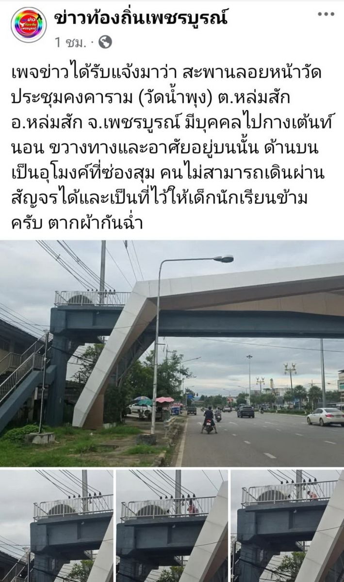 ผู้สื่อข่าวรายงานว่า เจ้าหน้าที่ตำรวจ สภ.หล่มสัก จ.เพชรบูรณ์ โดยการสั่งการของ พ.ต.อ.ปรเมษฐ โพยนอก ผกก.สภ.หล่มสัก และ พ.ต.ท.ศิริพงษ์ ธงห้า รอง ผกก.ป. ได้ส่งกำลังเข้าตรวจสอบสะพานลอยหน้าวัดประชุมคงคาราม หลังเพจ ‘ข่าวท้องถิ่นเพชรบูรณ์’ เผยแพร่ภาพสะพานลอยที่ถูกดัดแปลงเป็นที่พักอาศัยชั่วคราว