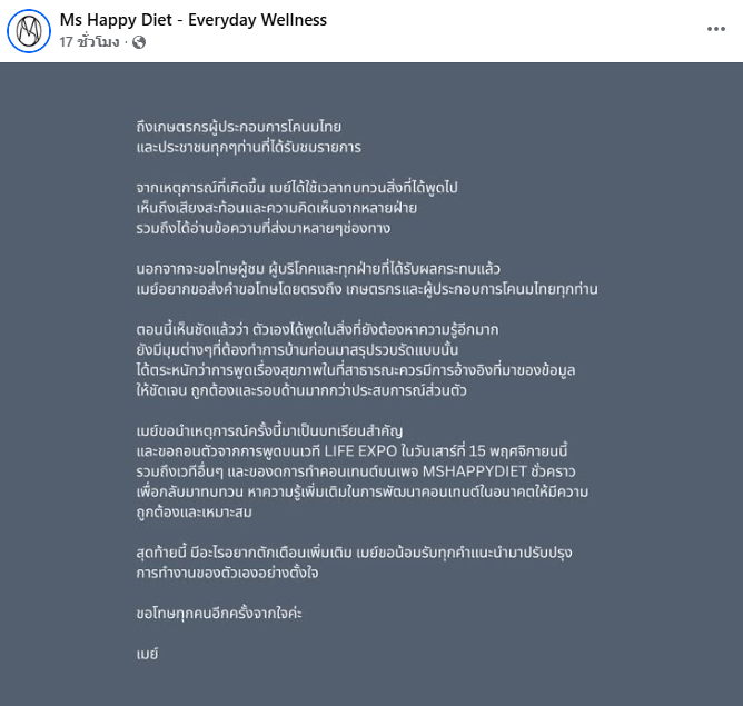 เมย์ขอนำเหตุการณ์ครั้งนี้มาเป็นบทเรียนสำคัญ และขอถอนตัวจากการพูดบนเวที LIFE EXPO ในวันเสาร์ที่ 15 พฤศจิกายนนี้ รวมถึงเวทีอื่นๆ และของดการทำคอนเทนต์บนเพจ MSHAPPYDIET ชั่วคราว เพื่อกลับมาทบทวน หาความรู้เพิ่มเติมในการพัฒนาคอนเทนต์ในอนาคตให้มีความ ถูกต้องและเหมาะสม