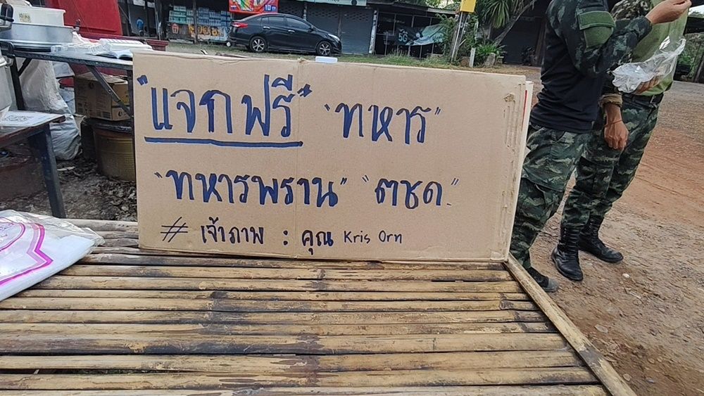 ทุกครั้งที่มีผู้ใหญ่ใจดีร่วมสมทบจะมีการติดป้ายแจ้งไว้หน้าร้านว่า “แจกฟรีสำหรับทหาร ทหารพราน และ ตชด.” เพื่อเป็นสัญลักษณ์ของความห่วงใยจากประชาชนแนวหลัง