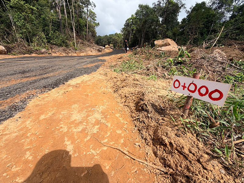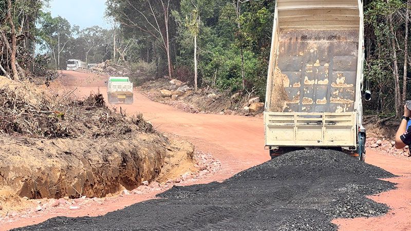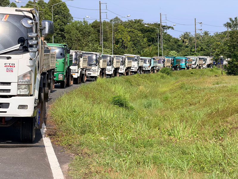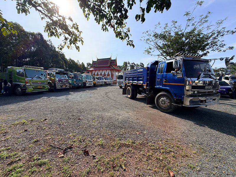 และในเวลา 9.00 น. ที่วัดท่าเส้น ต.แหลมกลัด อ.เมือง จ.ตราด พระศักดา สุนทโร พระวัดท่าเส้น ผู้ที่ริเริ่มเชิญชวนกลุ่มรถบรรทุกดิน (รถดั้ม) ร่วมทำบุญช่วยบรรทุกกากยางมะยางมะตอยจากหมวดทางหลวงแหลมกลัด แขวงทางหลวงตราด ระยะทางกว่า 20 กิโลเมตร ไปยังถนนความมั่นคงบ้าน 3 หลัง หลังมี่การเปิดเส้นทางเมื่อวันที่ 16 ตุลาคม 2568 โดยบรรยากาศเป็นไปอย่างคึกคัก หลังมีรถบรรทุก 6 ล้อ และ 4 ล้อ จากทั่วจังหวัดกว่า 100 คัน เดินทางมารับทำกิจกรรมวันนี้ ซึ่งรถบรรทุกต้องเดินทางไปรับกากยางมะตอย ที่ลอกออกจากพื้นถนนเก่า ภายในสำนักงานหมวดทางหลวงแหลมกลัด ต.แหลมกลัด แล้วขับไปยังถนนความมั่นคงบ้าน 3 หลัง เบื้องต้นคาดว่าจะใช้กากยางมะตายประมาณ 600 – 700 ตัน เป็นอย่างน้อยในการปูพื้นถนนเส้นนี้
