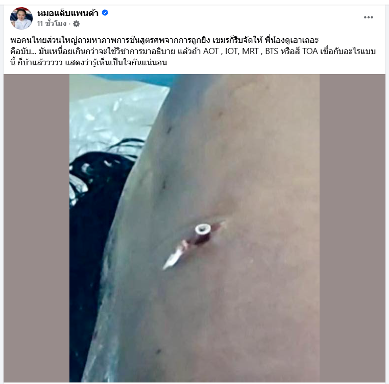 " พอคนไทยส่วนใหญ่ถามหาภาพการชันสูตรศพจากการถูกยิง เขมรก็รีบจัดให้ พี่น้องดูเอาเถอะ คือบับ... มันเหนื่อยเกินกว่าจะใช้วิชาการมาอธิบาย แล้วถ้า AOT , IOT, MRT , BTS หรือสี TOA เชื่อกับอะไรแบบนี้ ก็บ้าแล้ววววว แสดงว่ารู้เห็นเป็นใจกันแน่นอน "