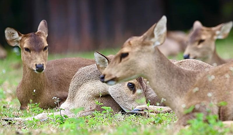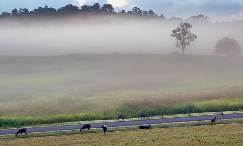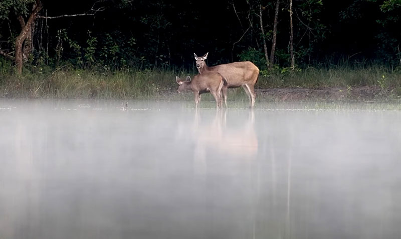 ซึ่งจะมีเก้ง กวาง เนื้อทราย ออกอวดโฉมรับแสงแรกความน่าตื่นตาตื่นใจในช่วงเช้าคือ การปรากฏตัวของ สัตว์ป่าหายาก ที่ออกมาหากินและอาบแดดคลายหนาวได้อย่างใกล้ชิด บริเวณทุ่งหญ้าหน้าพระตำหนักที่ประทับฯ พบเห็นทั้ง เก้ง กวาง และ เนื้อทราย นอนเคี้ยวเอื้องอย่างสบายอารมณ์อยู่บนยอดหญ้าที่ขาวโพลนด้วยน้ำค้าง ถือเป็นภาพที่หาชมได้ยากและถูกใจผู้ที่ชื่นชอบการถ่ายภาพสัตว์ป่าอย่างมาก เขตรักษาพันธุ์สัตว์ป่าภูเขียว-ทุ่งกระมัง มีความหลากหลายทางชีวภาพสูง ไม่เพียงแต่มีสัตว์ป่าประเภทกีบจำนวนมาก แต่ยังเป็นแหล่งอาศัยของ ช้างนับร้อยเชือก กระทิง และนกนานาชนิด เช่น นกยูง ไก่ฟ้า นกขุนแผน และนกหัวขวาน ซึ่งบ่งชี้ถึงความสำเร็จของการอนุรักษ์