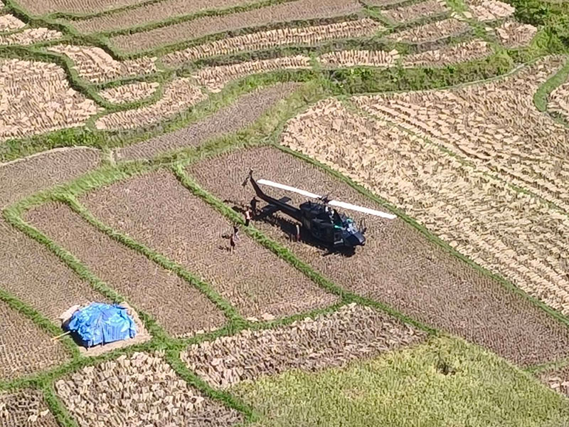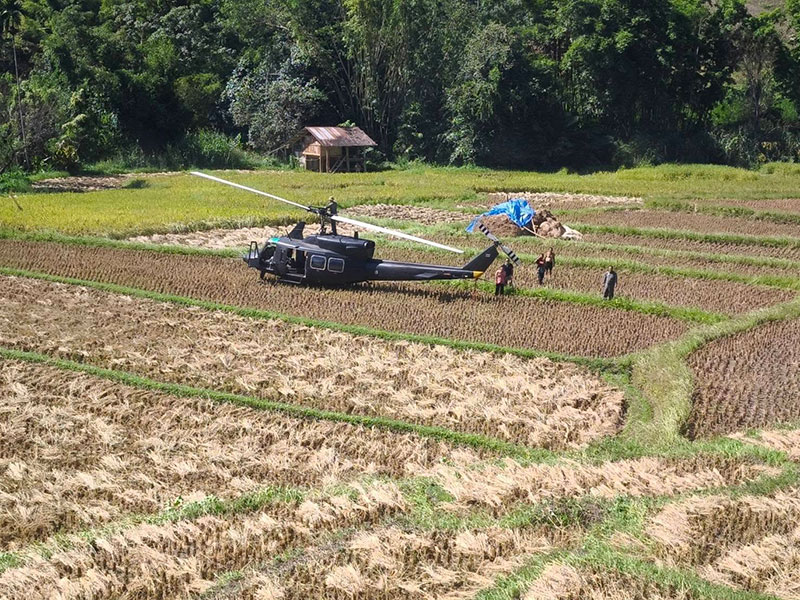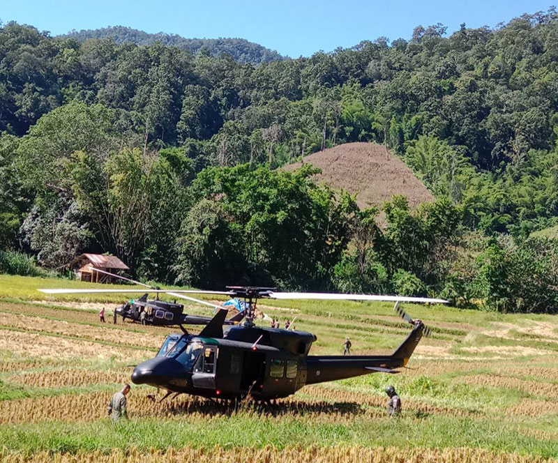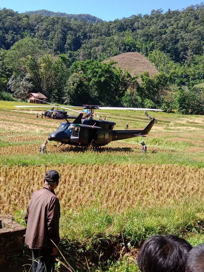 16 พฤศจิกายน 2568 เวลาประมาณ 11.00 น. ราษฎรบ้านห้วยต้นนุ่น ต.แม่เงา อ.ขุนยวม จ.แม่ฮ่องสอน แจ้งเหตุพบ เฮลิคอปเตอร์ของ หน่วยเฉพาะกิจสิงหนาท รุ่น เบลล์ 212 จำนวน 1 ลำ ลงจอดฉุกเฉินในที่นาของราษฎรที่เพิ่งเกี่ยวข้าวเสร็จใหม่ๆ โดยลำแรก ลงที่นาข้าว นายวิศิษฐ์ วิชญพันธ์ ลำที่ 2 ลงที่นาข้าว นายเทพพิทักษ์ ทอผ้าทอง ราษฎร บ้านห้วยต้นนุ่น หมู่ 4 ต.แม่เงา อ.ขุนยวม จ.แม่ฮ่องสอน สร้างความตกใจให้กับราษฎรในพื้นที่เป็นอย่างมาก