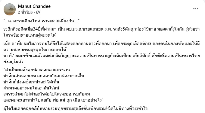 17 พฤศจิกายน 2568 พลเอก มนัส จันดี อดีตเสนาธิการทหาร กองบัญชาการกองทัพไทย โพสต์ข้อความผ่านเฟซบุ๊ก Manut Chandee ระบุว่า...