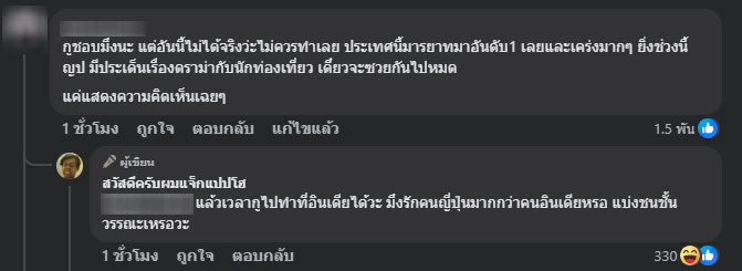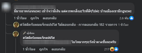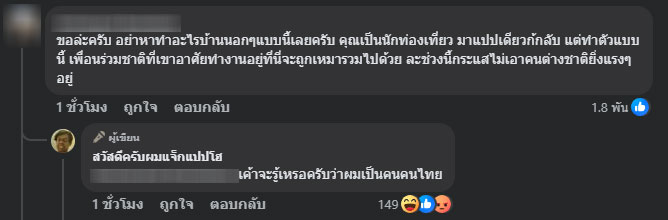 นอกจากนี้ยังมีชาวเน็ตจำนวนมากเข้ามาคอมเมนต์ว่า “มีมารยาทก่อนนะคะ เข้าใจว่ามีเงิน แต่ควรพกสิ่งดีๆ ไปค่ะ บ้านเมืองเขามีกฎนะคะ” อย่างไรก็ตาม แจ็กแปปโฮได้เข้ามาตอบกลับว่า “โมโหมากๆ ระวังน้ำตาลขึ้นนะครับ”