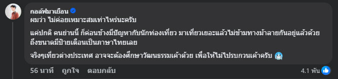 ขณะเดียวกัน กอล์ฟมาเยือน เพจบล็อกเกอร์ชื่อดัง ก็เข้ามาคอมเมนต์ ระบุว่า "ผมว่า ไม่ค่อยเหมาะสมเท่าไหร่นะครับ แค่ปกติ คนย่านนี้ ก็ค่อนข้างมีปัญหากับนักท่องเที่ยว มาเที่ยวเยอะแล้วไม่ข้ามทางม้าลายกันอยู่แล้วด้วย ถึงขนาดมีป้ายเตือนเป็นภาษาไทยเลย จริงๆเที่ยวต่างประเทศ อาจจะต้องศึกษาวัฒนธรรมเค้าด้วย เพื่อให้ไม่ไปรบกวนเค้าครับ"