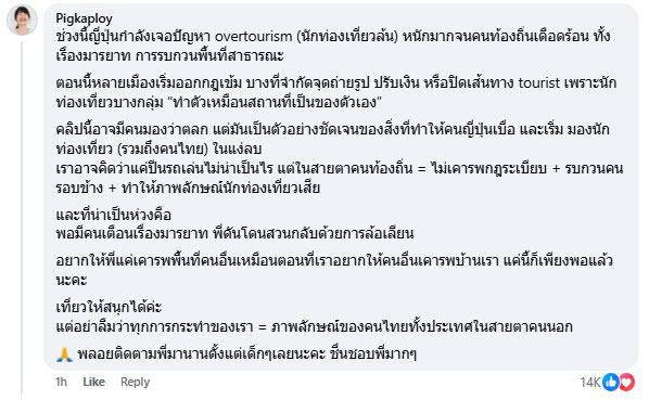 “ช่วงนี้ญี่ปุ่นกำลังเจอปัญหา overtourism (นักท่องเที่ยวล้น) หนักมากจนคนท้องถิ่นเดือดร้อน ทั้งเรื่องมารยาท การรบกวนพื้นที่สาธารณะ ตอนนี้หลายเมืองเริ่มออกกฎเข้ม บางที่จำกัดจุดถ่ายรูป ปรับเงิน หรือปิดเส้นทาง tourist เพราะนักท่องเที่ยวบางกลุ่ม “ทำตัวเหมือนสถานที่เป็นของตัวเอง”