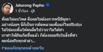 โดย แจ็กแปปโฮ ได้โพสต์ข้อความชี้แจงว่า “ที่ผมไม่ลบโพสต์ คือผมไม่ต้องการหนีปัญหา อย่างน้อย ๆ นี่ก็เป็นการผิดพลาดเพื่อแก้ไขปรับปรุง ไม่ใช่ลบเพื่อให้คนลืมไปว่าเราไม่ได้ทำ เราทำให้มันเกิดขึ้นแล้ว ก็ต้องยอมรับในสิ่งที่ทำ ผมน้อมรับทุกคำด่า ขออภัยทุกคนด้วยครับ”
