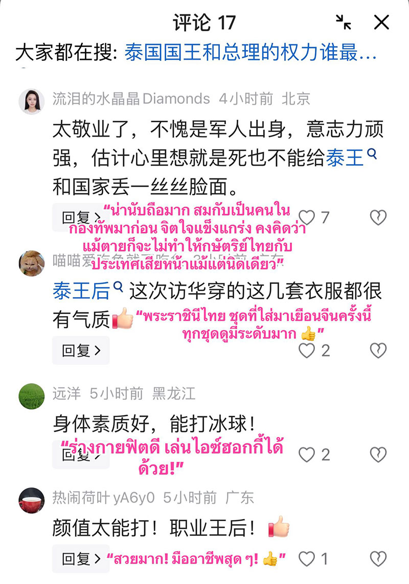 ทางเพจ 'สะใภ้จีนbyฮูหยินปักกิ่ง' โพสต์ข้อความระบุว่า คนจีน ชื่นชมพระราชินีไทย อย่างล้นหลาม—งดงาม สง่างาม และสมพระเกียรติทุกพระอิริยาบถ