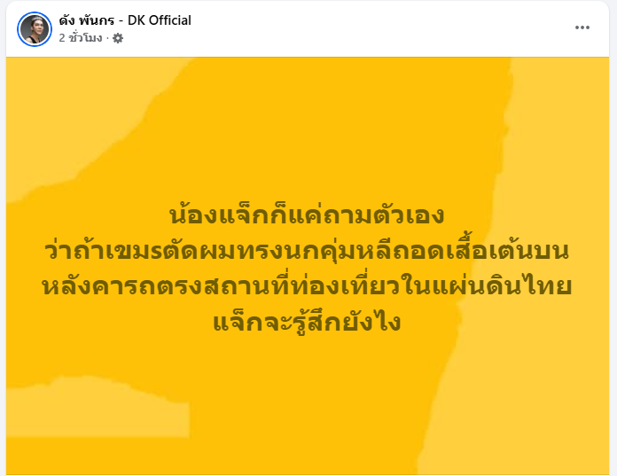 "น้องแจ็กก็แค่ถามตัวเอง ว่าถ้าเขมรตัดผมทรงนกคุ่มหลีถอดเสื้อเต้นบนหลังคารถตรงสถานที่ท่องเที่ยวในแผ่นดินไทย แจ็กจะรู้สึกยังไง"