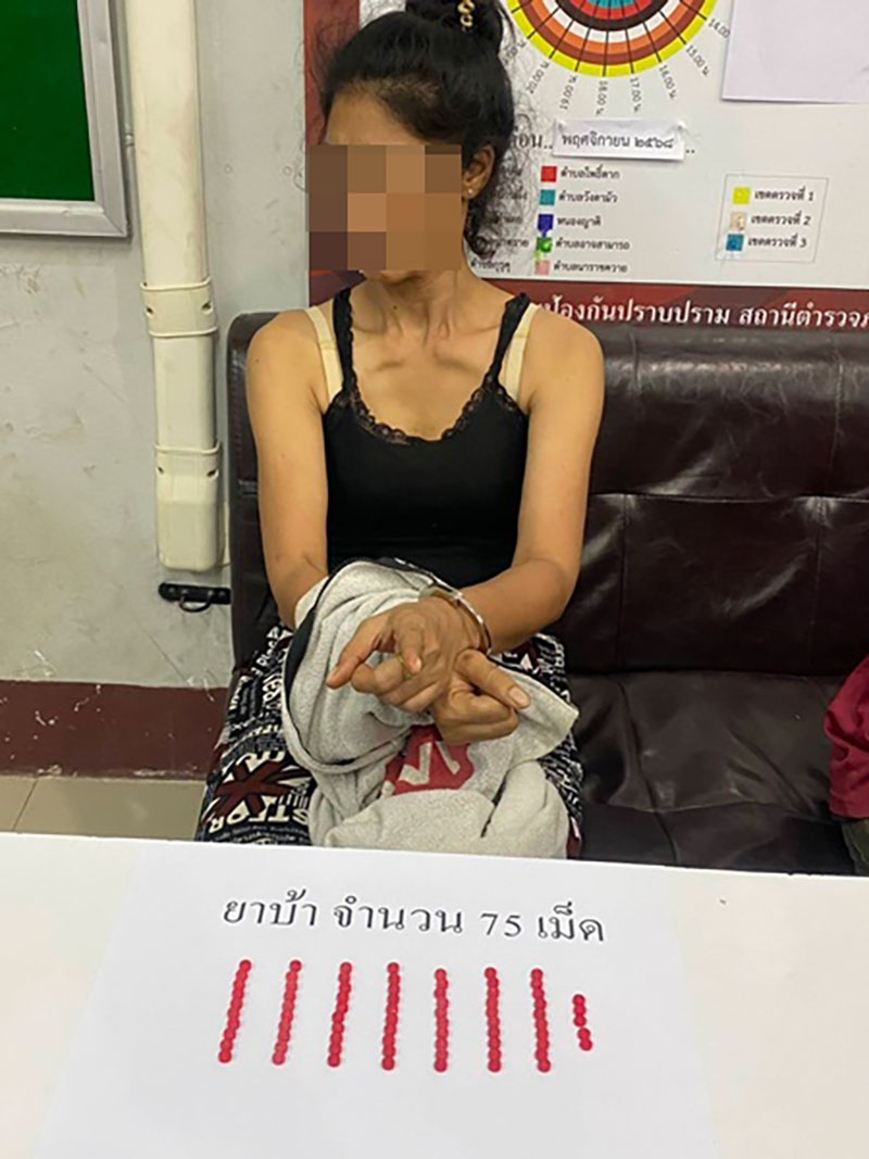 โดย น.ส.อรุณี มีกระเป๋าถือติดตัวตลอด จึงขออนุญาตตรวจค้น พบยาบ้าบรรจุอยู่ในถุงพลาสติกสีใส โดยแบ่งใส่ 7 ถุงจำนวนถุงละ 10 เม็ดรวมเป็น 70 เม็ด และได้สอบถามว่ายังมีอีกไหม น.ส.อรุณีบอกยังอยู่ในห้องนอนอีก 5 เม็ด จึงนำตัวไปสอบสวนเพิ่มเติมที่โรงพัก พร้อมตรวจหาสารเสพติดในร่างกายพบฉี่เป็นสีม่วง