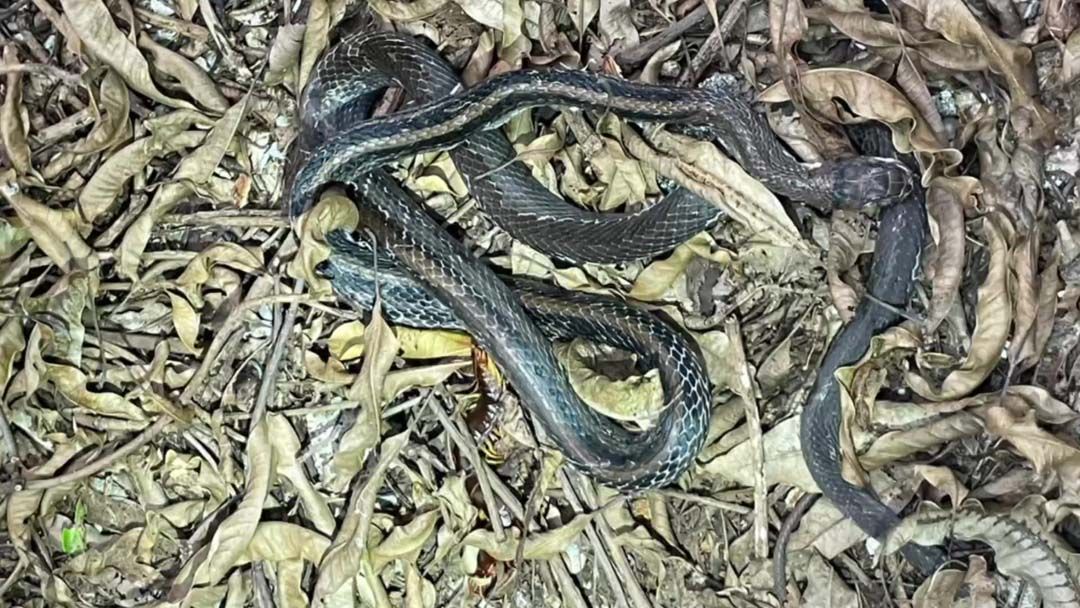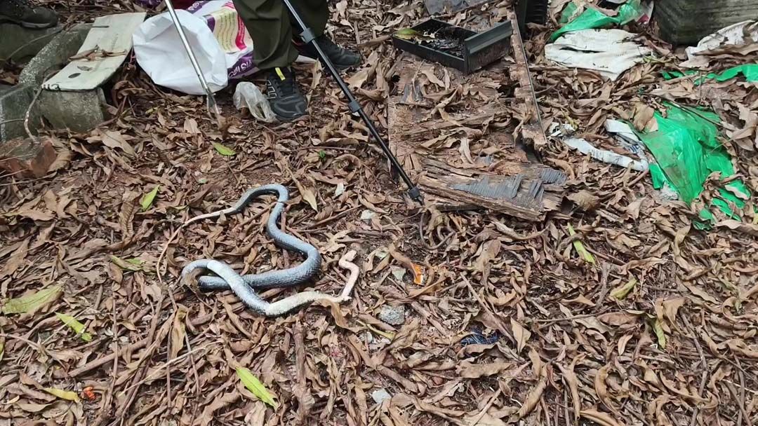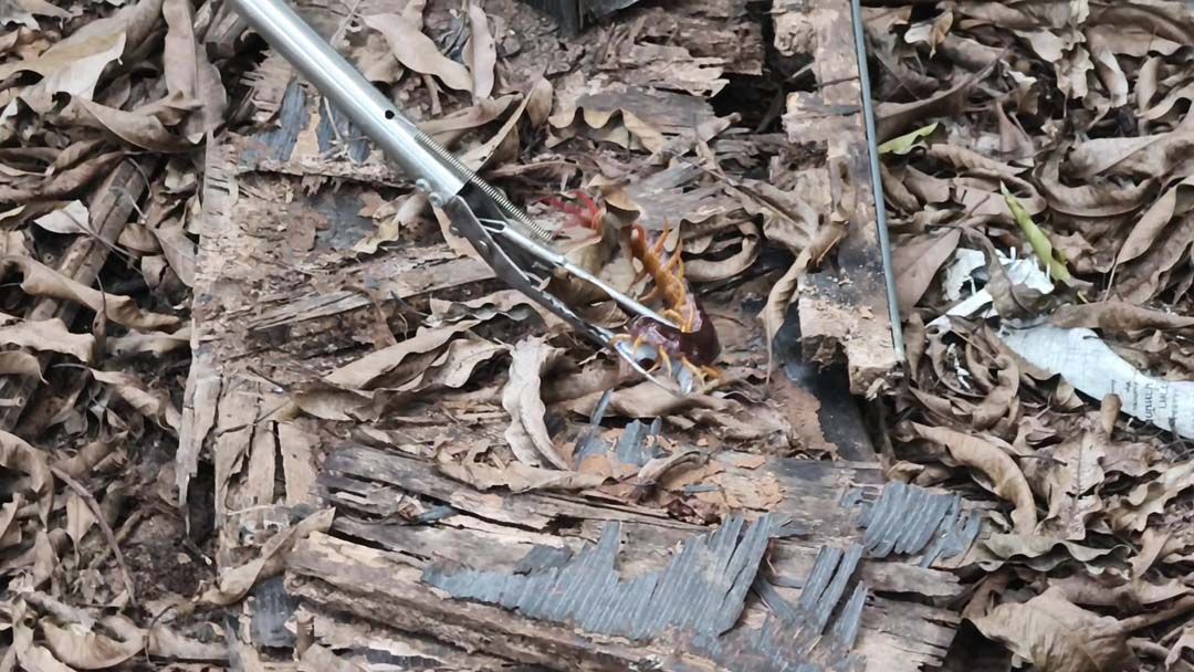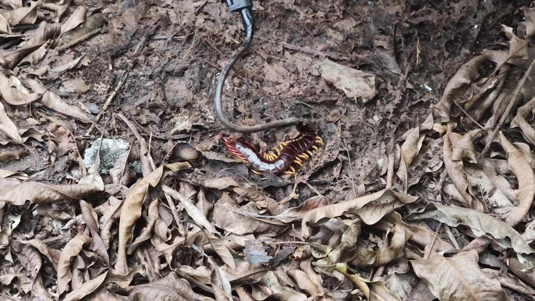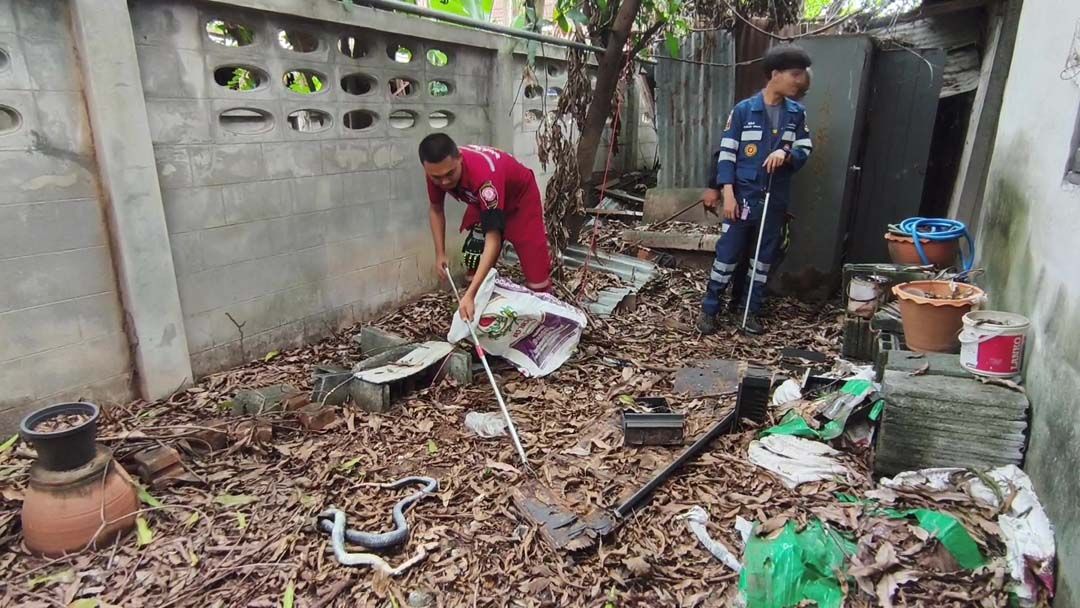 จากการตรวจสอบพบก็งูทางมะพร้าวขนาดใหญ่ นอนขดตายอยู่บนพื้นรกใบไม้ปิดคลุมหลังบ้านแล้ว ใกล้กันพบตะขาบขนาดใหญ่กำลังกัดแทะซากงู ก่อนหลบไปใต้แผ่นไม้ คาดว่าสัตว์ทั้งสองอาจต่อสู้กัน และงูสู้ไม่ไหวจึงถูกตะขาบกัดจนเสียชีวิต จากนั้นทีมกู้ภัยจึงใช้อุปกรณ์จับตะขาบนำใส่ถุงปุ๋ย เพื่อนำไปปล่อยในพื้นที่ธรรมชาติต่อไป