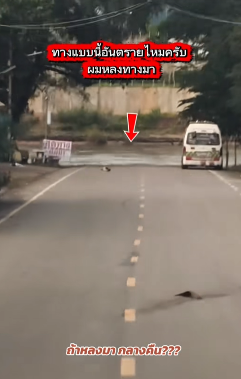 ในคลิปวิดีโอเผยให้เห็นถนนเส้นเล็กๆ ที่ถูกตัดขาดโดยสายน้ำอย่างสิ้นเชิง ขณะที่ป้ายเตือน "สุดทาง แม่น้ำ" กลับมีขนาดเล็กจนแทบมองไม่เห็นเมื่อขับมาด้วยความเร็วปกติ