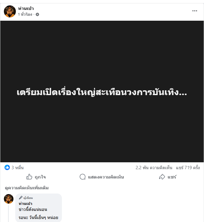 โดยเมื่อช่วงบ่ายที่ผ่านมา (19 พ.ย. 2568) เพจ "ท่านเปา" ได้โพสต์ข้อความสั้นๆ เพียงไม่กี่ประโยค ระบุว่า "เตรียมเปิดเรื่องใหญ่สะเทือนวงการบันเทิง…" พร้อมทั้งระบุเพิ่มเติมถึงความมั่นใจในข้อมูลที่จะนำเสนอ โดยทิ้งท้ายให้ติดตามอย่างใกล้ชิด "ข่าวนี้ดังแน่นอน รอนะ วันนี้เย็นๆหน่อย"