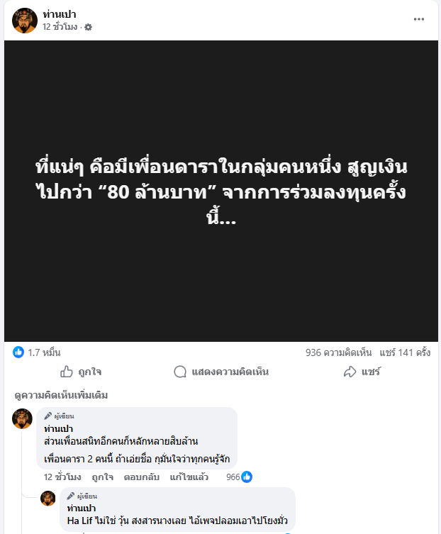 ท่านเปา ยังระบุอีกโพสต์ด้วยว่า "ที่แน่ๆ คือมีเพื่อนดาราในกลุ่มคนหนึ่ง สูญเงินไปกว่า “80 ล้านบาท” จากการร่วมลงทุนครั้งนี้…"