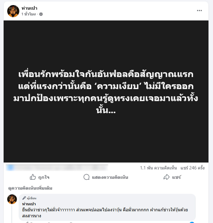 ล่าสุด เพจดัง "ท่านเปา" ได้โพสต์ข้อความสั้น ๆ แต่สุดแซ่บ ที่ทำเอาบรรดาขาเผือกต้องเข้ามาส่องและวิเคราะห์อย่างหนัก โดยระบุว่า "เพื่อนรักพร้อมใจกันอัลฟอลคือสัญญาณแรก แต่ที่แรงกว่านั้นคือ ความเงียบ ไม่มีใครออกมาปกป้องเพราะทุกคนรู้ ดูทรงเคยเจอมาแล้วทั้ง นั้น"