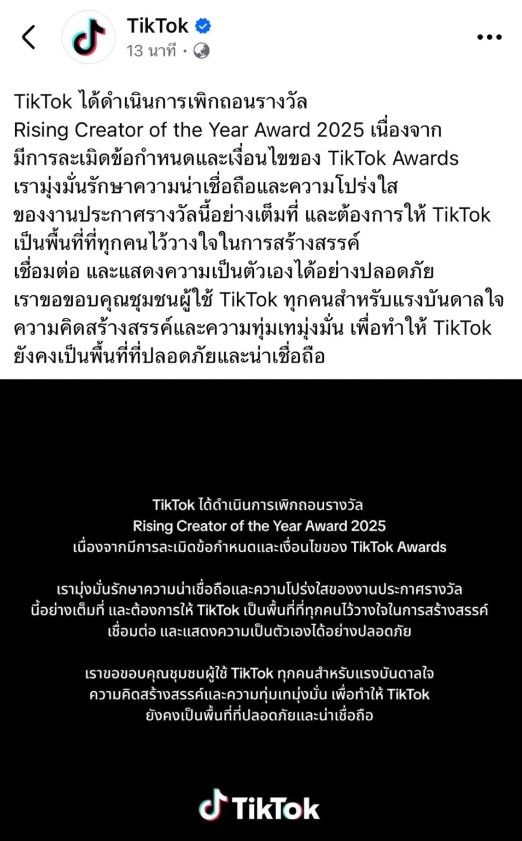 “TikTok ได้ดำเนินการเพิกถอนรางวัล Rising Creator of the Year Award 2025 เนื่องจากมีการละเมิดข้อกำหนดและเงื่อนไขของ TikTok Awards เรามุ่งมั่นรักษาความน่าเชื่อถือและความโปร่งใสของงานประกาศรางวัลนี้อย่างเต็มที่ และต้องการให้ TikTok เป็นพื้นที่ที่ทุกคนไว้วางใจในการสร้างสรรค์ เชื่อมต่อ และแสดงความเป็นตัวเองได้อย่างปลอดภัย