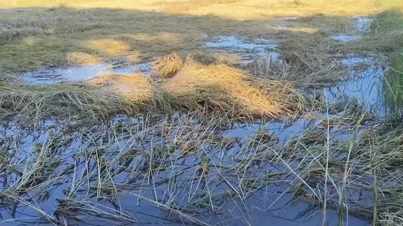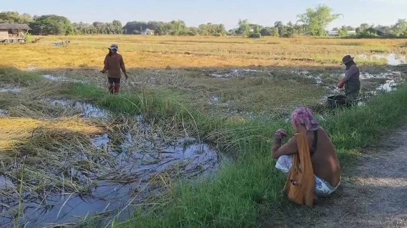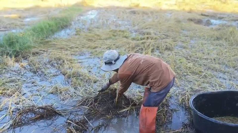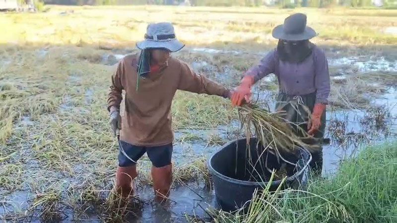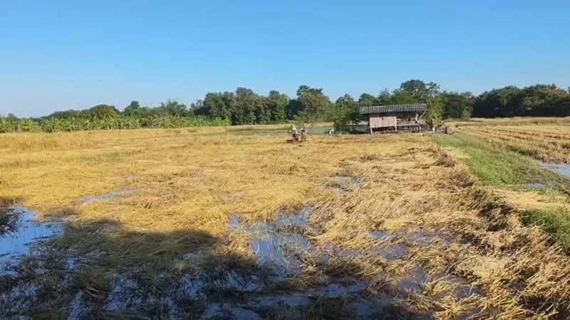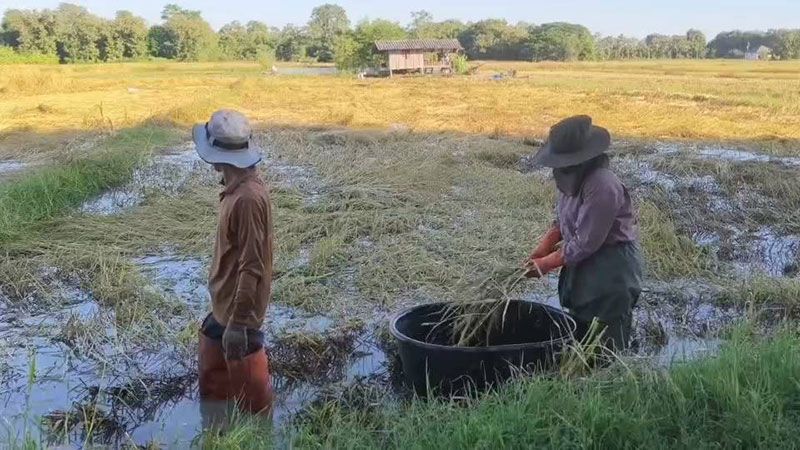 หัวใจชาวนาพะเยาแทบสลาย ข้าวจมน้ำ 2 อาทิตย์ ต้องใช้ถังปูนลุยเก็บเกี่ยวเศษสุดท้ายก่อนเน่าคาต้น