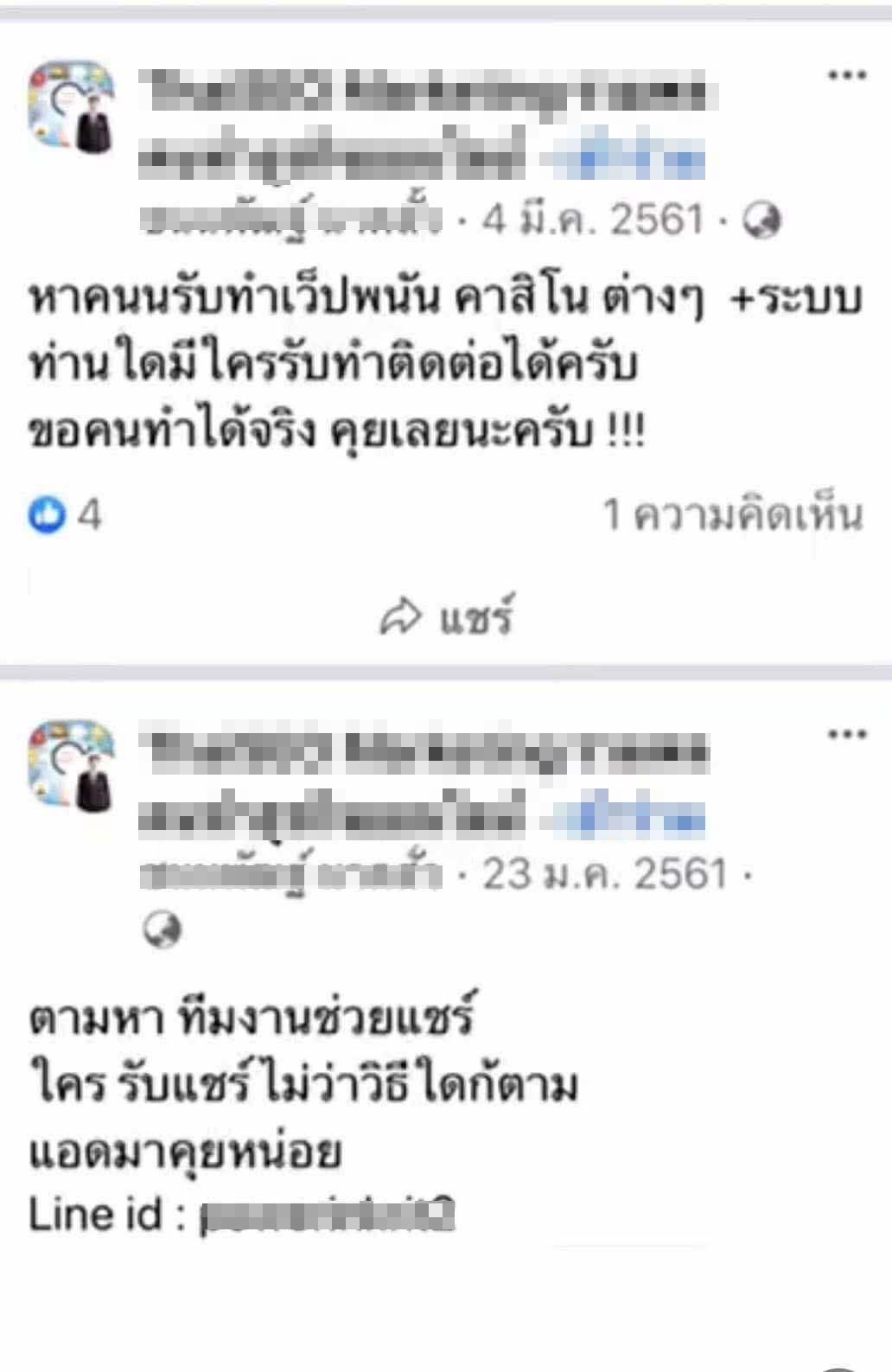 โพสต์ปี 2561 เขียนเองว่า “หาคนรับทำเว็บพนันคาสิโนระบบต่าง ๆ ขอคนทำได้จริง” หาคนช่วยแชร์ ทำคอนเทนต์ปั่นเว็บพนัน