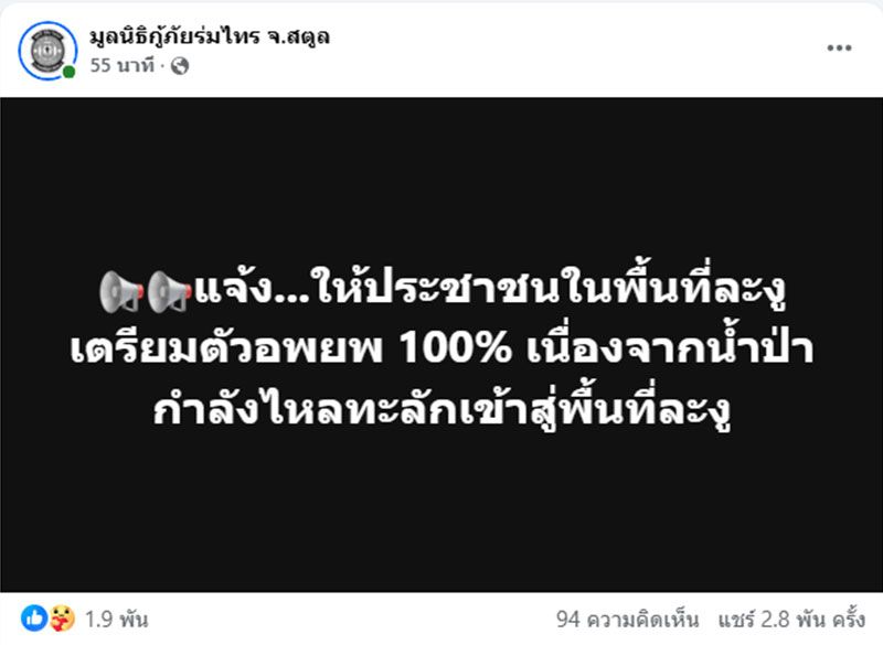 วันที่ 25 พฤศจิกายน 2568 เพจเฟซบุ๊ก "มูลนิธิกู้ภัยร่มไทร จ.สตูล" โพสต์รายงานว่า แจ้ง...ให้ประชาชนในพื้นที่ละงู เตรียมตัวอพยพ 100% เนื่องจากน้ำป่ากำลังไหลทะลักเข้าสู่พื้นที่ละงู