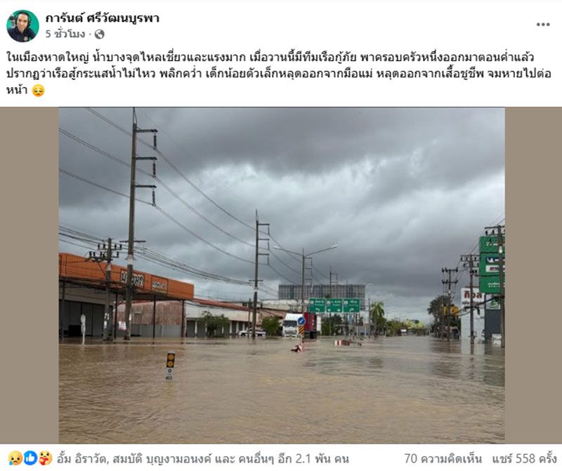 วันที่ 26 พฤศจิกายน 2568 เพจเฟซบุ๊กชื่อ "การันต์ ศรีวัฒนบูรพา" ผู้ช่วยโฆษกสถาบันการแพทย์ฉุกเฉินแห่งชาติ โพสต์ข้อความระบุว่า ในเมืองหาดใหญ่ น้ำบางจุดไหลเชี่ยวและแรงมาก เมื่อวานนี้มีทีมเรือกู้ภัย พาครอบครัวหนึ่งออกมาตอนค่ำแล้ว ปรากฏว่าเรือสู้กระแสน้ำไม่ไหว พลิกคว่ำ เด็กน้อยตัวเล็กหลุดออกจากมือแม่ หลุดออกจากเสื้อชูชีพ จมหายไปต่อหน้า