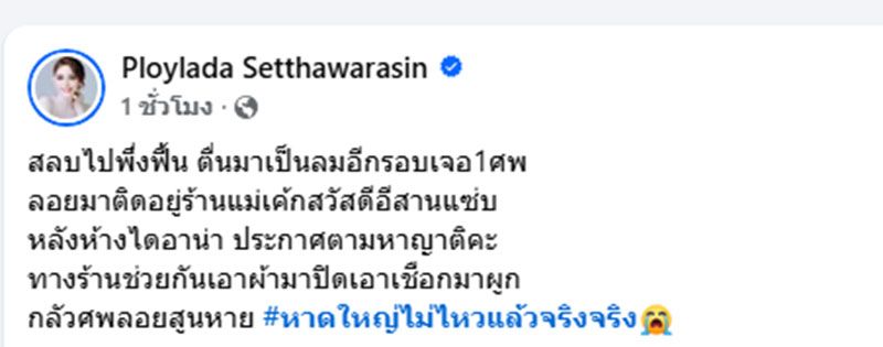 ล่าสุด เมื่อเวลา 12.54 น. ผู้ใช้เฟซบุ๊ก "Ploylada Setthawarasin" ได้โพสต์ภาพสุดสะเทือนใจ พร้อมข้อความ ระบุว่า สลบไปเพิ่งฟื้น ตื่นมาเป็นลมอีกรอบเจอ 1 ศพ ลอยมาติดอยู่ร้านแม่เค้กสวัสดีอีสานแซ่บ ประกาศตามหาญาติค่ะ ทางร้านช่วยกันเอาผ้ามาปิดเอาเชือกมาผูก กลัวศพลอยสูญหาย #หาดใหญ่ไม่ไหวแล้วจริงๆ