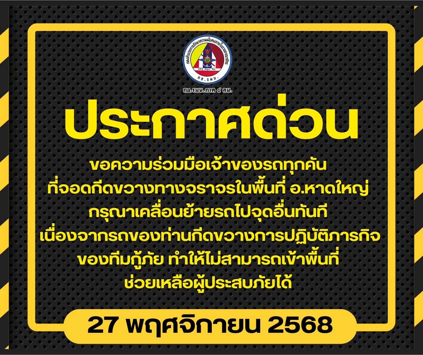 เมื่อวันทีค่ 27 พ.ย.2568 เพจเฟซบุ๊ก "กองอำนวยการรักษาความมั่นคงภายในภาค 4 ส่วนหน้า" ได้โพสต์ข้อความระบุว่า "ประกาศด่วน! โปรดเคลื่อนย้ายรถยนต์ออกจากเส้นทาง และจุดที่กีดขวางการจราจร ขอความร่วมมือจากเจ้าของยานพาหนะทุกคันที่จอดกีดขวางทางจราจรในขณะนี้ กรุณาช่วยเคลื่อนย้ายรถของท่านไปยังจุดอื่นที่สามารถจอดรถได้ เนื่องจากสถานการณ์ฉุกเฉิน รถยนต์ของท่านได้กลายเป็นเป็นอุปสรรคสำคัญ ในการปฏิบัติภารกิจของ ทีมกู้ภัย ทำให้ไม่สามารถเข้าพื้นที่และให้ความช่วยเหลือผู้ประสบภัยได้"