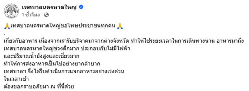 วันที่ 27 พฤศจิกายน 2568 เวลา 12.38 น. เพจเฟซบุ๊ก "เทศบาลนครหาดใหญ่" โพสต์ข้อความว่า เทศบาลนครหาดใหญ่ขอโทษประชาชนทุกคน เกี่ยวกับอาหาร เนื่องจากเรารับบริจาคมาจากต่างจังหวัด ทำให้ใช้ระยะเวลาในการเดินทางนาน อาหารมาถึงเทศบาลนครหาดใหญ่ช่วงดึกมาก ประกอบกับไม่มีไฟฟ้าและปริมาณน้ำยังสูงและเชี่ยวมาก ทำให้การส่งอาหารเป็นไปอย่างยากลำบาก