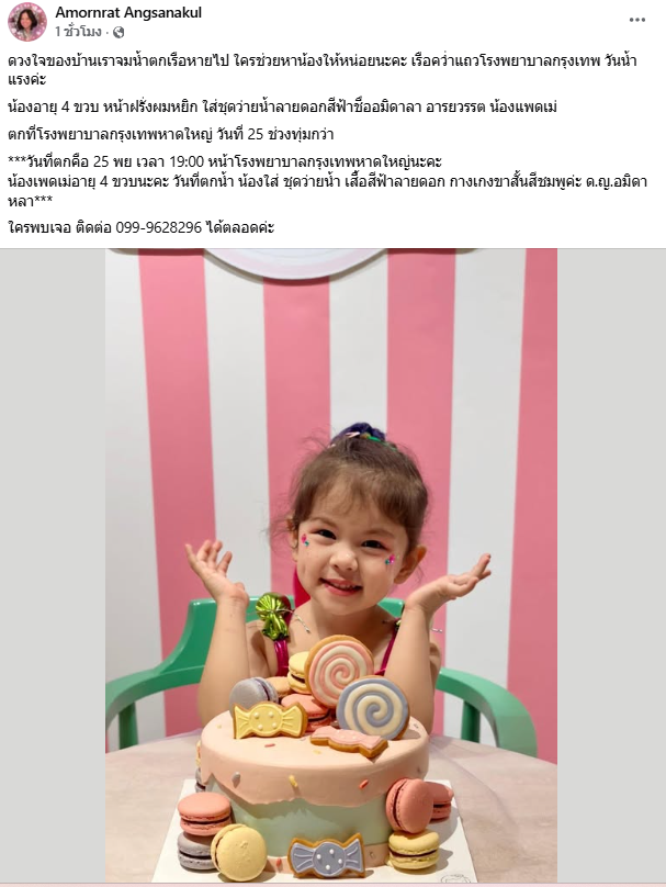 27 พ.ย. 68 ผู้ใช้เฟซบุ๊ก Amornrat Angsanakul ประกาศช่วยตามหา น้องวัย 4 ขวบ โดยระบุว่า ดวงใจของบ้านเราจมน้ำตกเรือหายไป ใครช่วยหาน้องให้หน่อยนะคะ เรือคว่ำแถวโรงพยาบาลกรุงเทพ วันน้ำแรงค่ะ