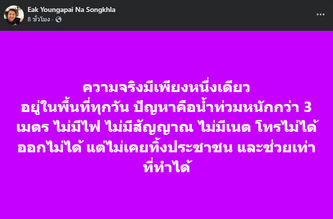 ล่าสุด นายเอก ยังอภัย ณ สงขลา โพสต์ข้อความผ่านทางเฟซบุ๊ก ชี้แจงต่อคำสั่งดังกล่าว ความว่า ความจริงมีเพียงหนึ่งเดียว อยู่ในพื้นที่ทุกวัน ปัญหาคือน้ำท่วมหนักกว่า 3 เมตร ไม่มีไฟ ไม่มีสัญญาณ ไม่มีเน็ต โทรไม่ได้ ออกไม่ได้ แต่ไม่เคยทิ้งประชาชน และช่วยเท่าที่ทำได้