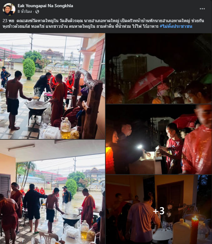 และต่อมา โพสต์ภาพ พร้อมข้อความ ระบุว่า 23 พ.ย.2568 คณะสงฆ์วัดหาดใหญ่ใน วัดสันติวรคุณ นายอำเภอหาดใหญ่ เปิดครัวหน้าบ้านพักนายอำเภอหาดใหญ่ ช่วยกันหุงข้าวด้วยแก๊ส ทอดไข่ แจกชาวบ้าน คนหาดใหญ่ใน ยามค่ำคืน ที่น้ำท่วม ไร้ไฟ ไร้อาหาร