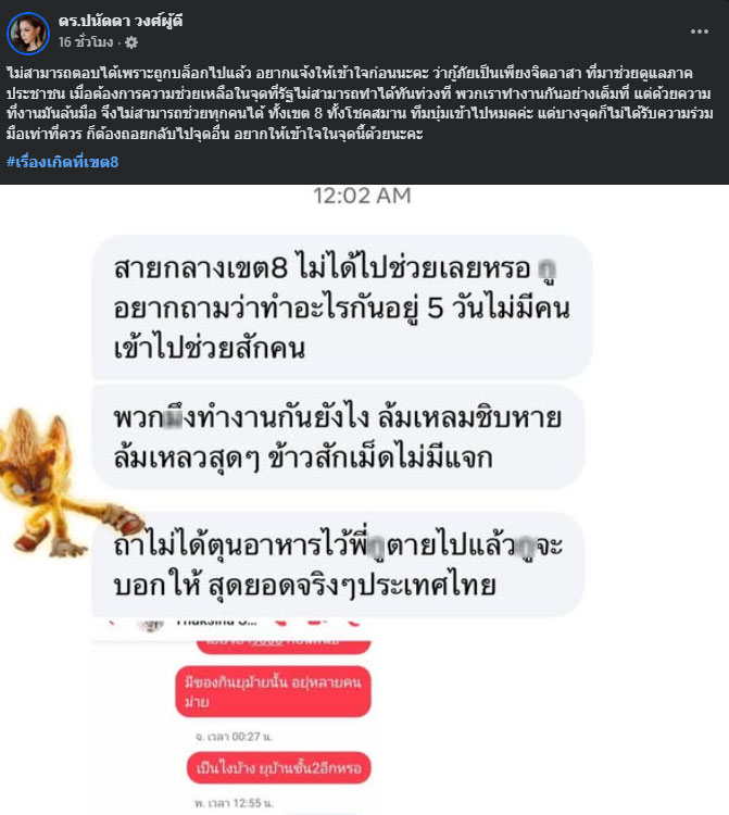 โดยข้อความภายในบทสนทนาระบุว่า “สายกลางเขต 8 ไม่ได้ไปช่วยเลยหรอ xูอยากถามว่าทําอะไรกันอยู่ 5 วันไม่มีคน เข้าไปช่วยสักคน พวกxึงทํางานกันยังไง ล้มเหลวxิบหาย ล้มเหลวสุด ๆ ข้าวสักเม็ดไม่มีแจก ถ้าไม่ได้ตุนอาหารไว้พี่xูตายไปแล้ว xูจะบอกให้ สุดยอดจริง ๆ ประเทศไทย”