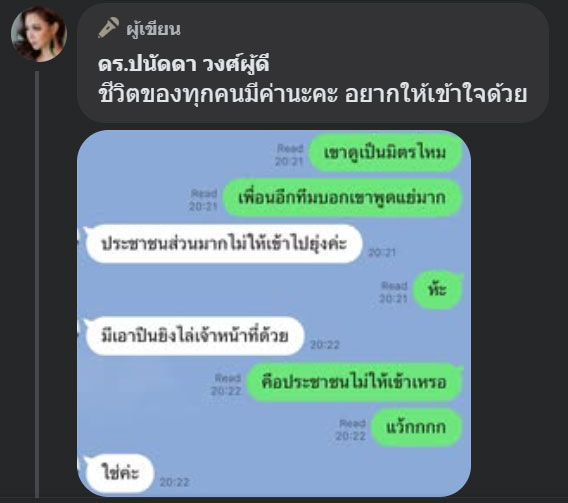 นอกจากนี้เธอยังอธิบายใต้คอเมนต์เพิ่มเติมว่า “ชีวิตของทุกคนมีค่านะคะ อยากให้เข้าใจด้วย” และ แนบรูปที่พูดคุบกับบุคคลหนึ่ง เผยว่า ประชาชนส่วนมากในพื้นที่ดังกล่าวไม่ให้เข้าไปยุ่งและมีการยิงปืนใส่เจ้าหน้าที่อีกด้วย