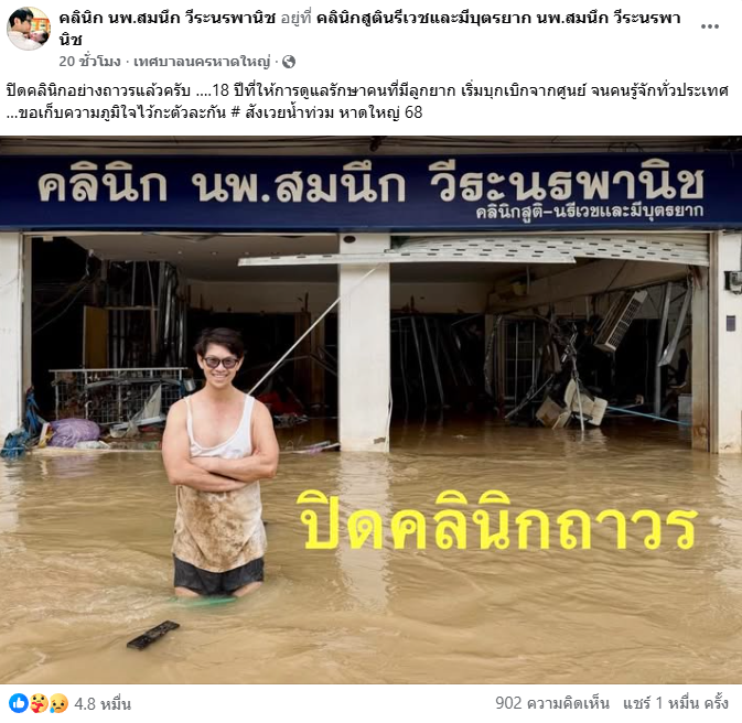 28 พ.ย. 68 เพจเฟซบุ๊ก คลินิก นพ.สมนึก วีระนรพาณิช คลินิกสูตินรีเวชและมีบุตรยากชื่อดัง ได้ประกาศปิดคลินิกอย่างถาวร โดยในภาพมี นพ.สมนึก วีระนรพาณิช ยืนอยู่ในน้ำที่ท่วมสูงถึงระดับเอวบริเวณหน้าคลินิก พร้อมข้อความที่ระบุว่า "ปิดคลินิกอย่างถาวรแล้วครับ 18 ปี ที่ให้การดูแลรักษาคนที่มีลูกยาก เริ่มบุกเบิกจากศูนย์ จนคนรู้จักทั่วประเทศ ขอเก็บความภูมิใจไว้กะตัวละกัน สังเวยน้ำท่วม หาดใหญ่ 68"