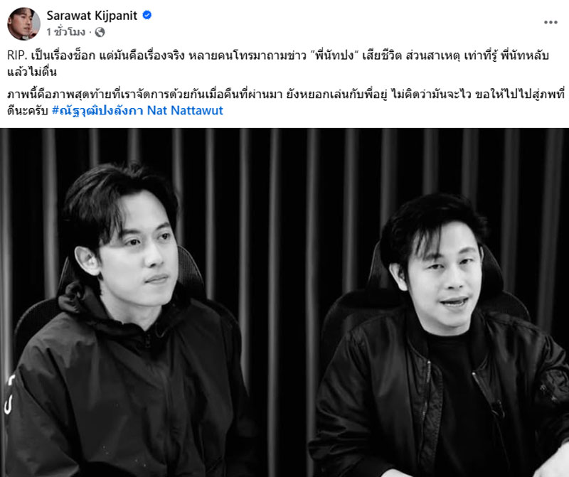 ภาพนี้คือภาพสุดท้ายที่เราจัดรายการด้วยกันเมื่อคืนที่ผ่านมา ยังหยอกเล่นกับพี่อยู่ ไม่คิดว่ามันจะไว ขอให้ไปสู่ภพที่ดีนะครับ #ณัฐวุฒิปงลังกา Nat Nattawut